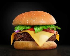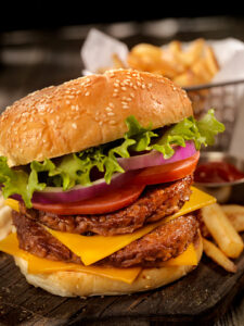 Pain burger, steak végétal, fromage fines herbes, tomates, salade